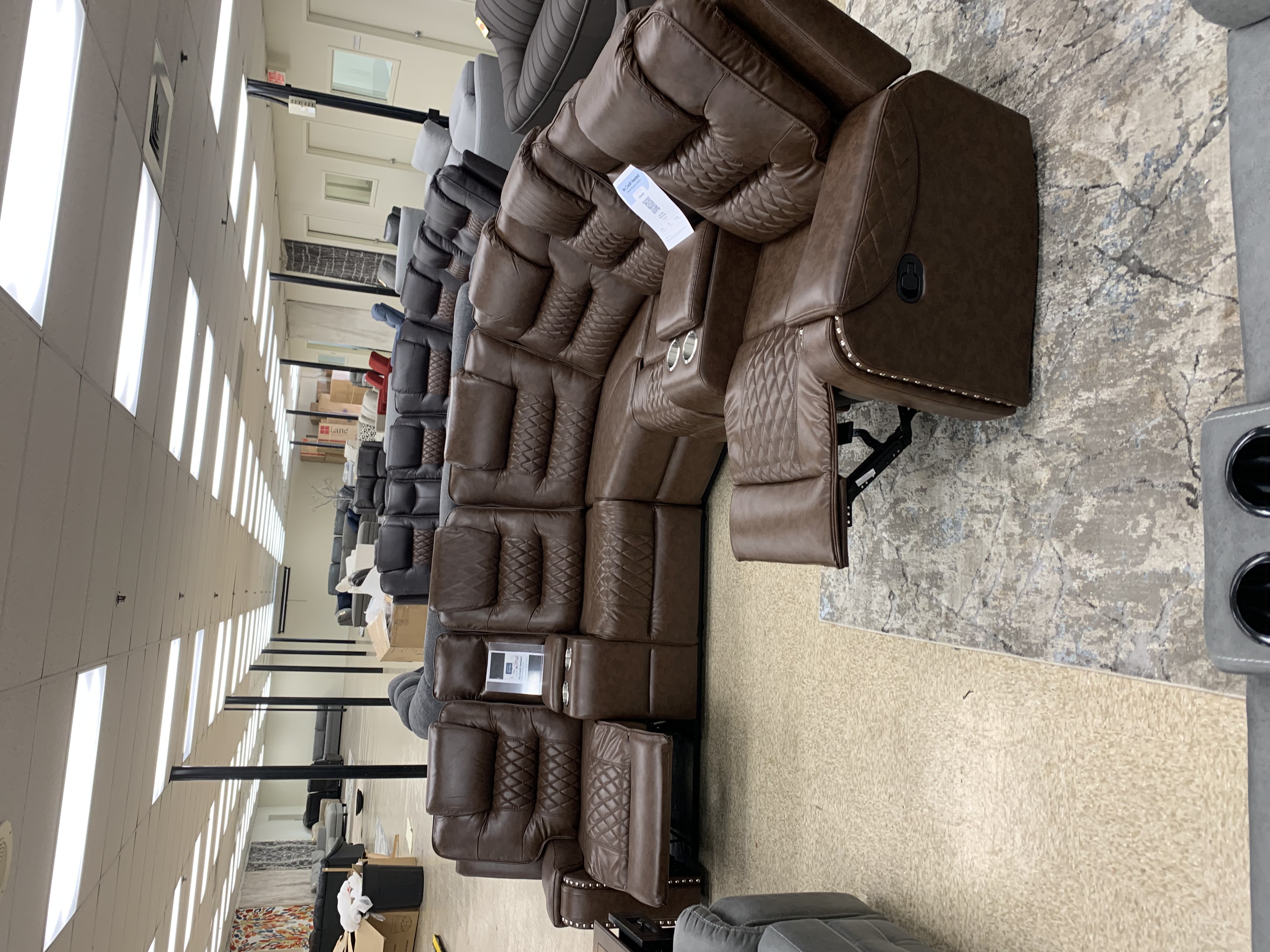 Product Description New! Either in box or out - 2 recliners - 2 middle storage consoles - faux leather material - furniture world brand - 118x118 roughly