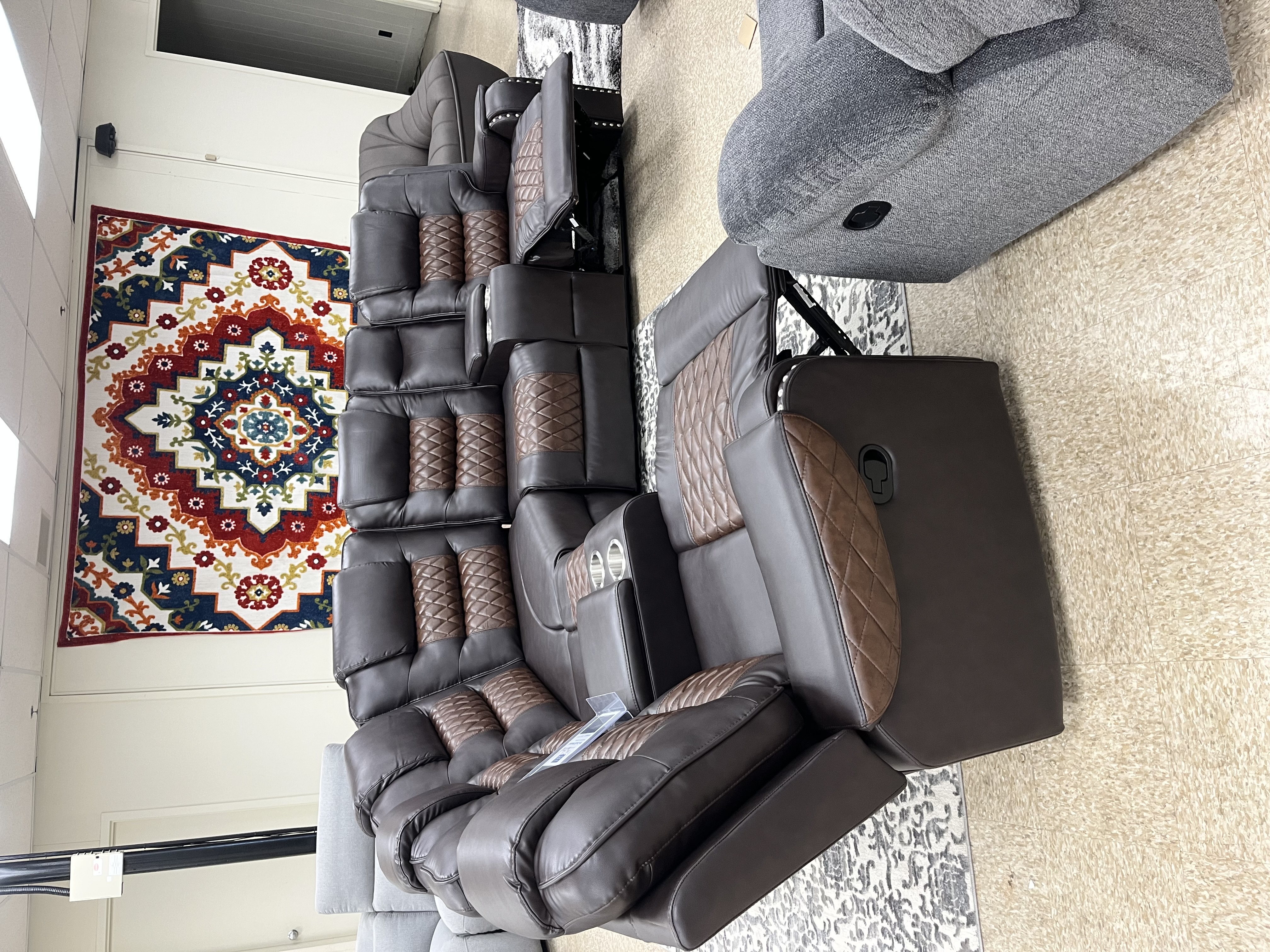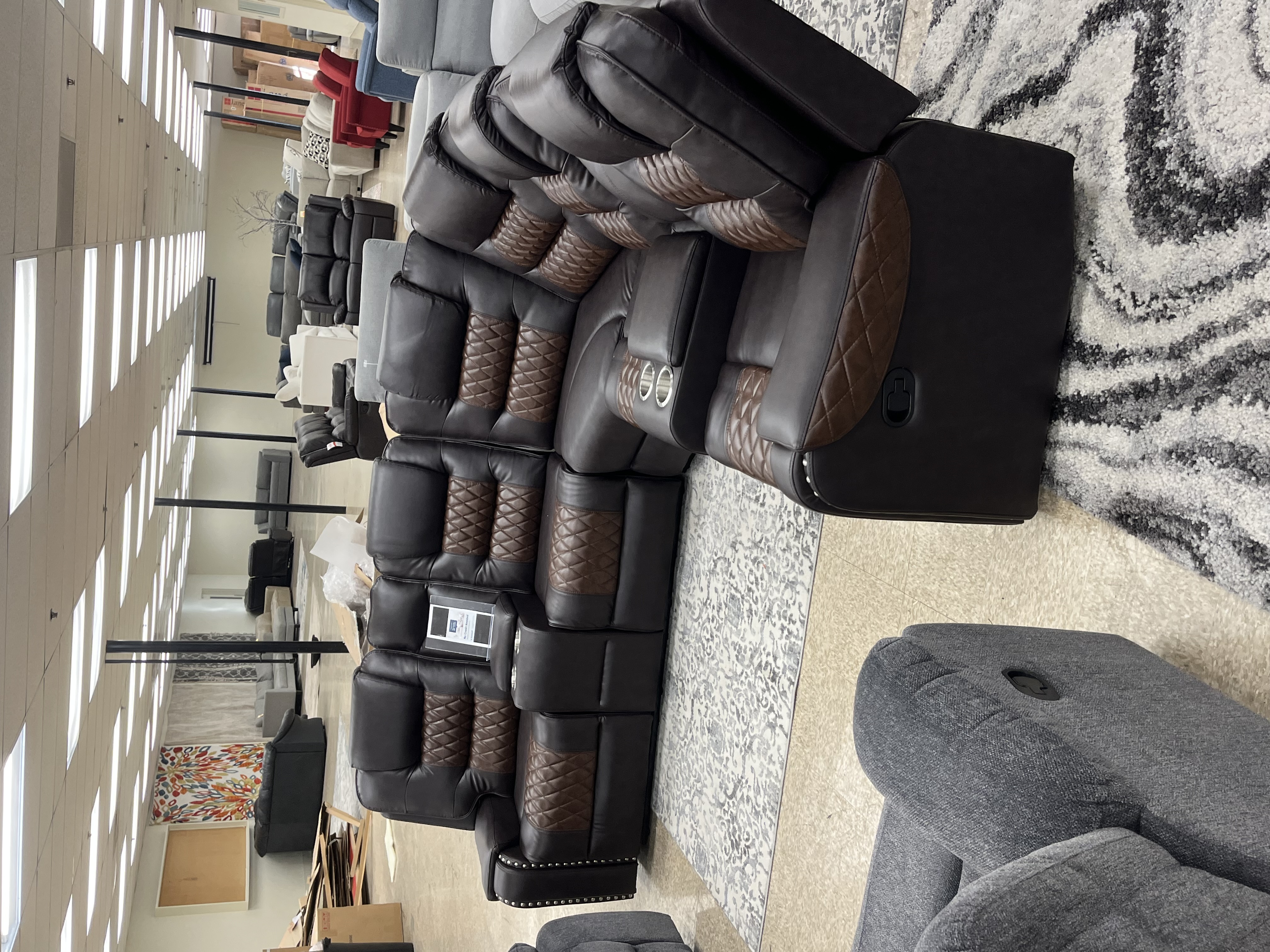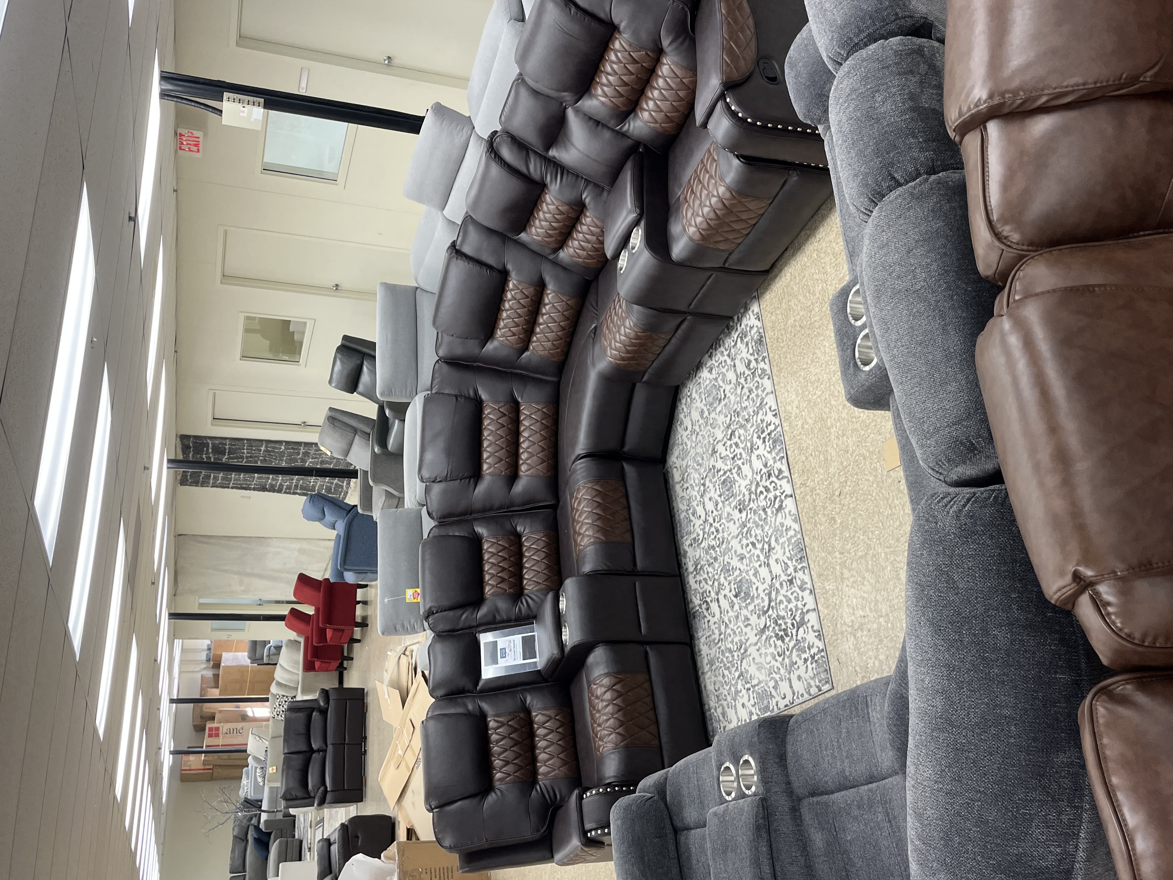 Product Description - 118x118 roughly - 2 recliners - 2 middle consoles and storage - Faux leather - brand new! Some in box some out!